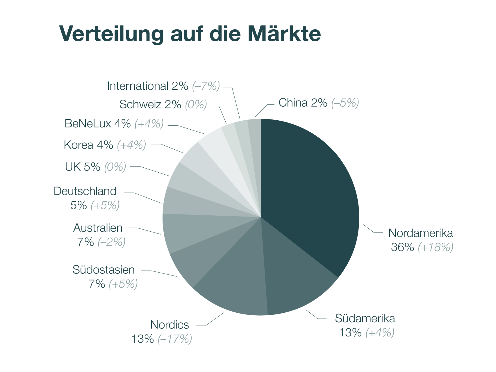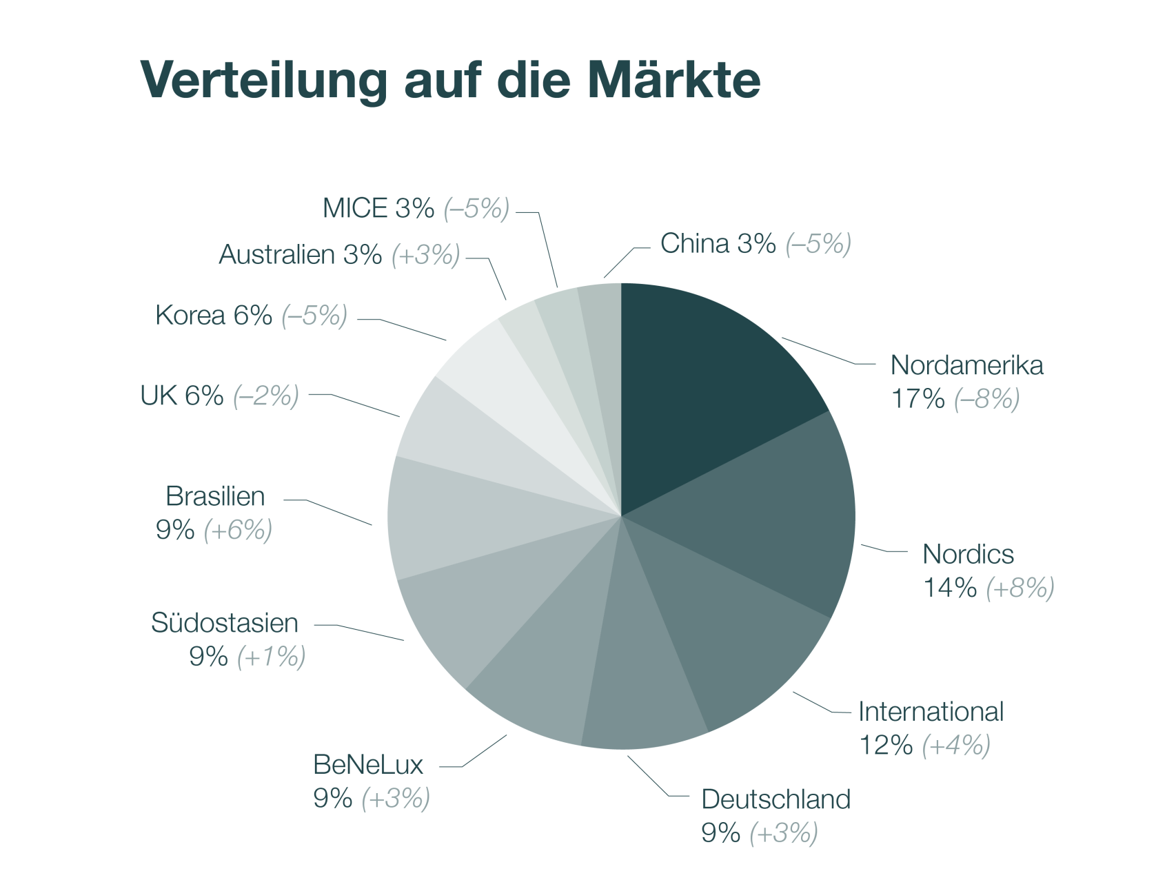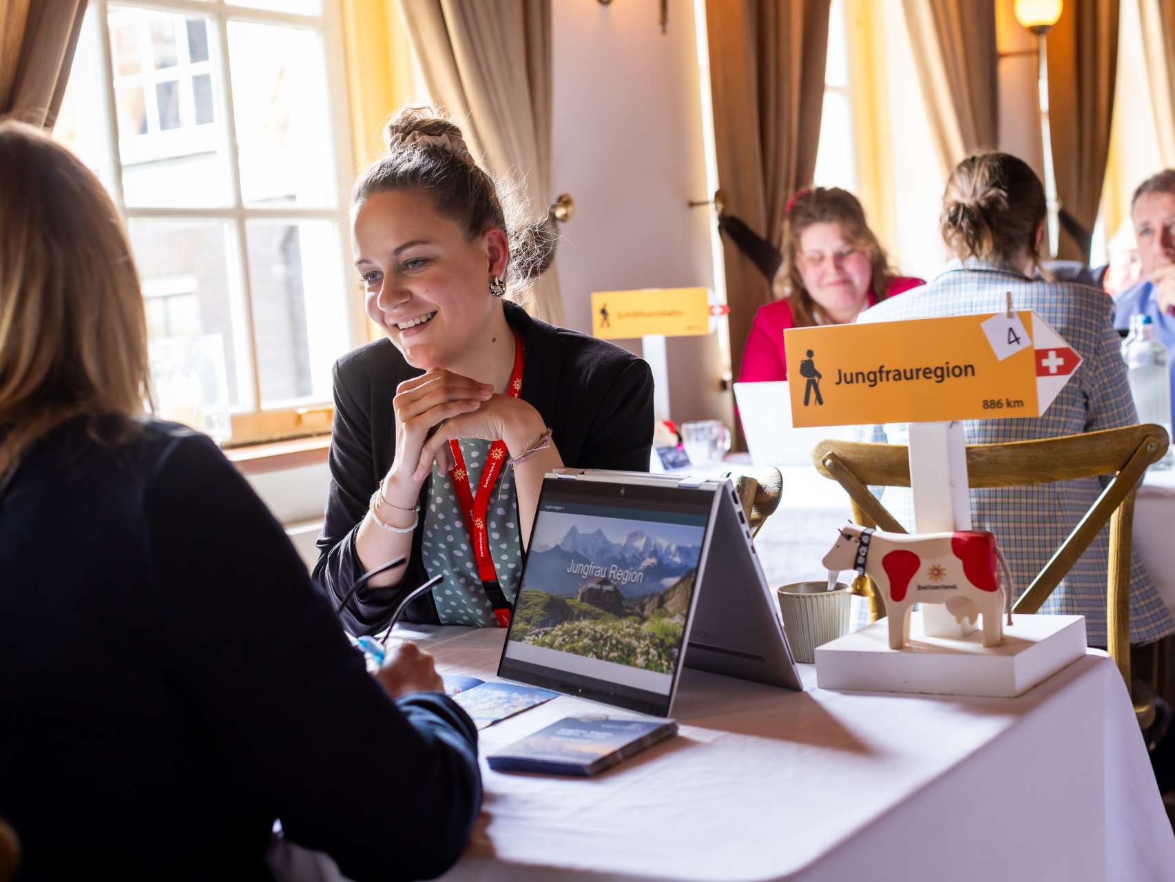 Bei den Messen unterscheiden wir zwischen Business-to-Business (B2B)-Messen und Business-to-Customer (B2C)-Messen. Unser Fokus liegt auf Ersteren. Die B2B-Messen nutzen wir, um bestehende Kontakte zu treffen und neue Kontakte zu knüpfen. Vordefinierte Meetings und Networking mit Reiseagenturen und Reiseveranstaltern stehen im Vordergrund. Auf 33 B2B-Messen haben wir 2024 über 3096 Kontakte erreicht – mit Nordamerika als grösstem Markt.