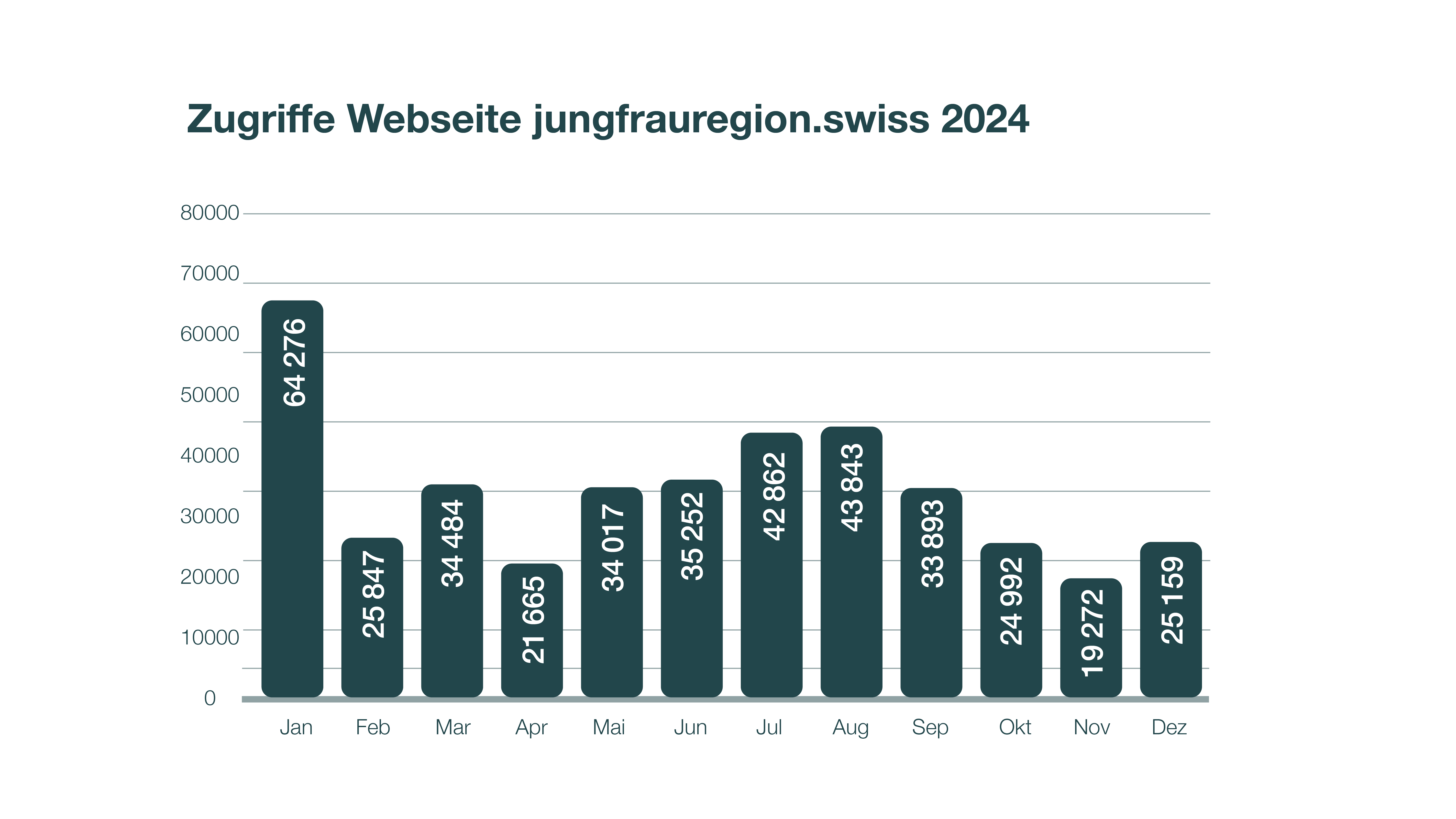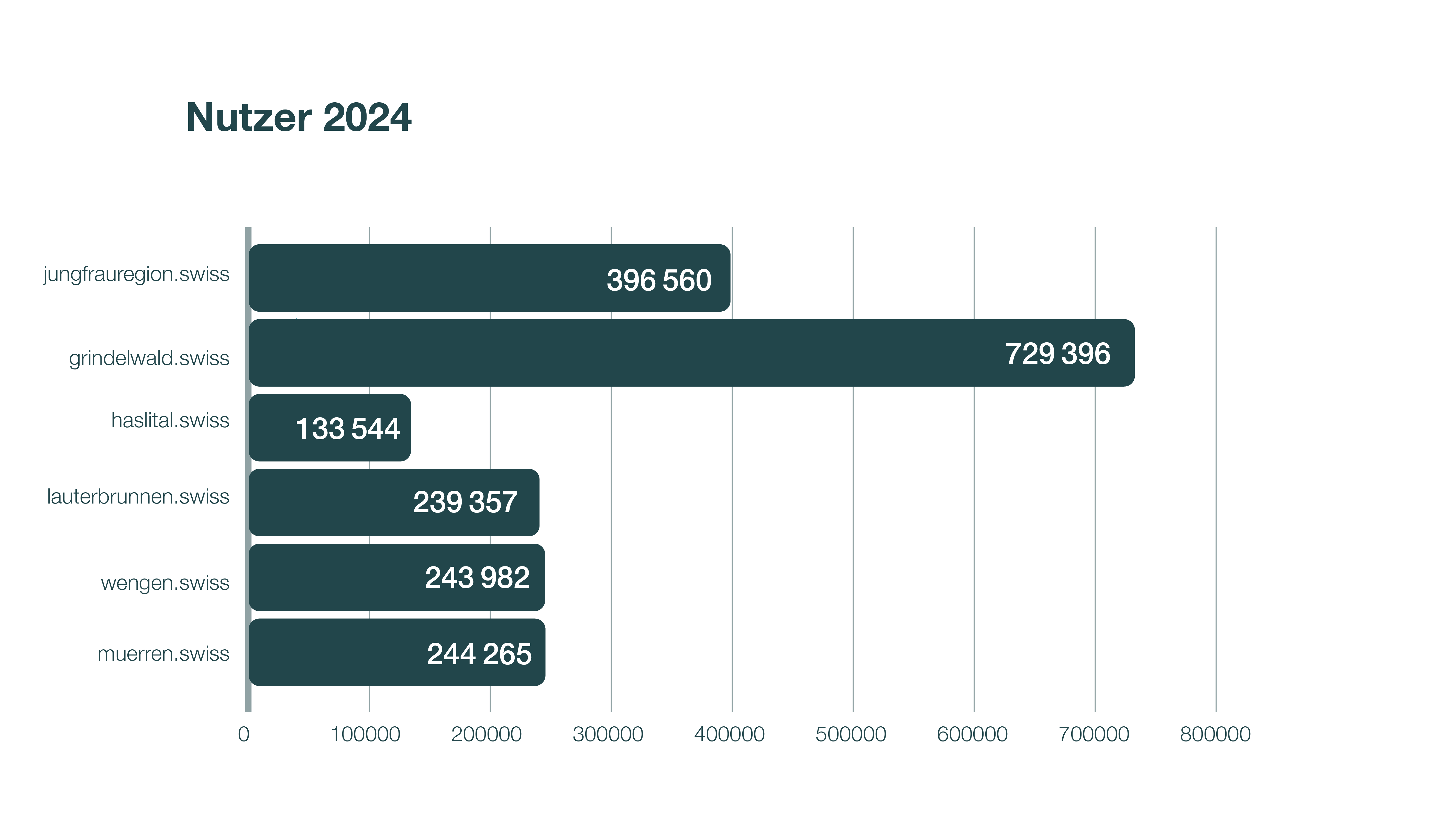 Wie oft wurde 2024 jungfrauregion.swiss besucht? In welchem Monat verzeichnete die Webseite am meisten Zugriffe? Das erfährst du auf dieser Seite. Ebenso die Nutzerzahlen der Webseiten unserer fünf Resorts.